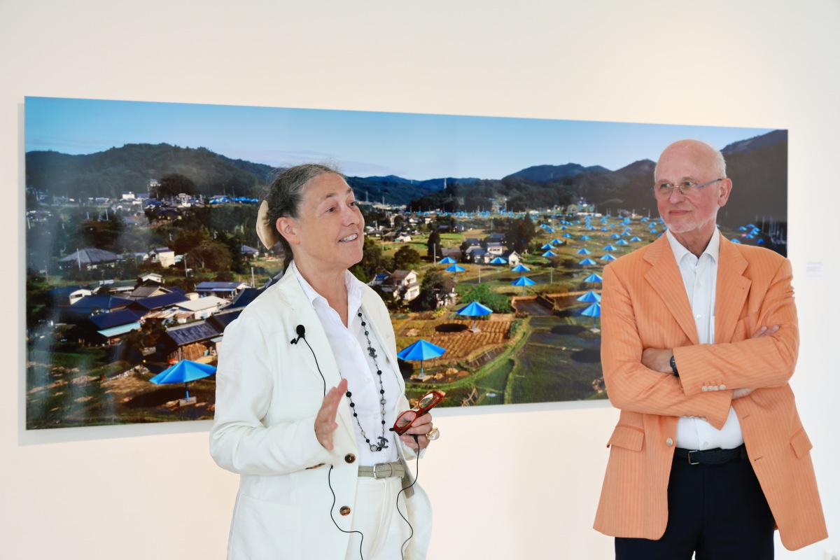 Anschließend wanderten die Festbesucher hinab ins 1. OG, wo die Ausstellung von Christo & Jeanne-Claude feierlich eröffnet wurde. Neben Dr. Dorothea van der Koelen selbst sprachen noch zwei weitere Redner und berichteten sowohl persönlich als auch fachkundig über das berühmte Künstlerpaar und die jahrelange Zusammenarbeit. Zuerst sprach die Kunstjournalistin und langjährige Freundin von Christo & Jeanne-Claude, Linde Rohr-Bongard. Die Gattin von Willi Bongard und Herausgeberin des Kunstkompass begleitete das Duo seit 1971 und steuerte zahlreiche Anekdoten und Begebenheiten bei, die ein sehr lebendiges Bild von Christo & Jeanne-Claude vermittelten.